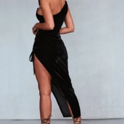 Robe Corset Mi-longue En Velours Froncé Noir à Bretelles En Perles