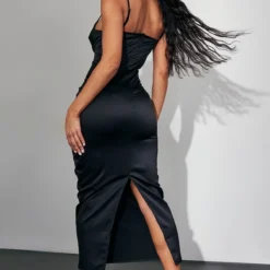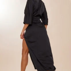 Robe Longue Satinée Noire Fendue à Décolleté Plongeant Et Manches Chauve-souris