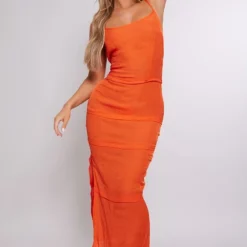 Robe Longue Texturée Orange Métalisée à Lanières Croisées Dans Le Dos