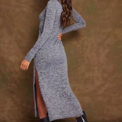 Robe Longue En Jersey Gris Anthracite à Manches évasées Et Détail Contours