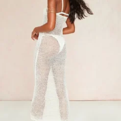 Maternité Robe De Grossesse Longue En Maille Crochet Orange Ajourée Sur Les Côtés