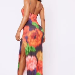 Robe Fendue Longue En Mesh Multicolore Imprimé Abstrait à Dos Nu
