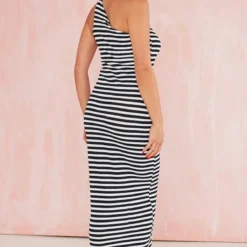 Robe De Plage Longue Effet Lin Noir Et Blanc Imprimé Zèbre à Dos Nu Et Découpes