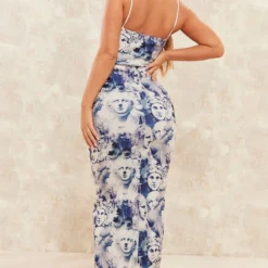 Robe Longue Bleue Imprimé Renaissance Tissée Stretch à Boutons Et Bretelles