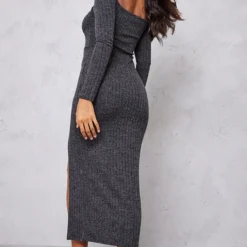 Robe Longue Côtelée Chinée Gris Anthracite à Découpes Et Manches Longues
