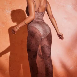 Robe Longue En Mesh Transparent Fleuri Chocolat Froncée Sur Le Buste à Bretelles