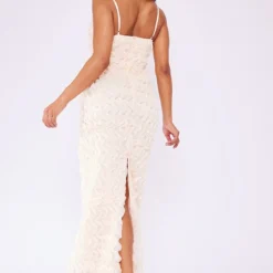 Robe Longue En Mousseline De Soie Crème Volantée à Col Bénitier Et Bretelles