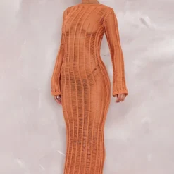 Robe Longue En Maille Tricot Marron Clair à Franges Et Dos Nu
