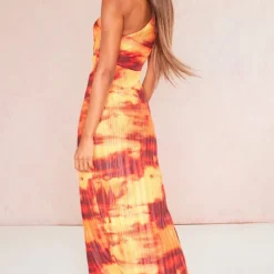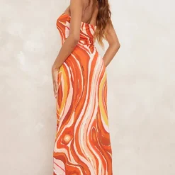 Robe Longue Découpée En Mousseline De Soie Marron à Imprimé Abstrait Et Col Bardot