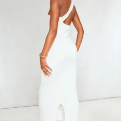 Robe Longue Côtelée Texturée Crème à Bretelles Asymétriques