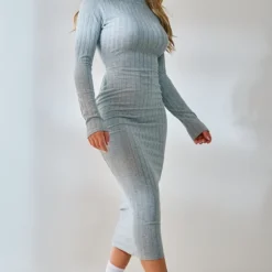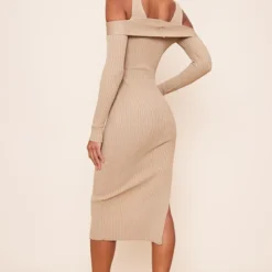Robe Mi-longue En Maille Tricot Côtelée Camel à Manches Longues Et Rabat