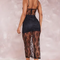 Robe Mi-longue En Dentelle Noire à Bretelles Et Détail Découpe