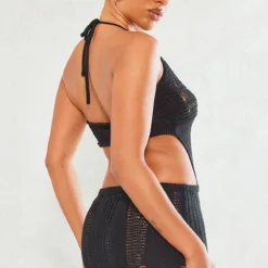 Mini Robe En Maille Tricot Transparente Noire à Ourlet Effiloché