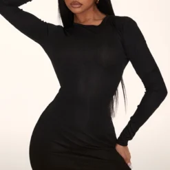 Robe Moulante Côtelée Noire à Manches Longues Et Contours Structurés