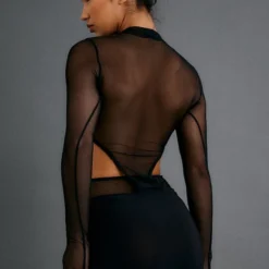 Robe Moulante En Mesh Froncé Noir à Côtés Découpés Et Manches Longues