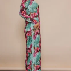 Robe Mi-longue Plissée Rose Imprimé Roses à Manches Longues Et Fente