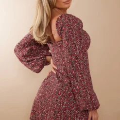 Robe Droite Col Carré Et Manches Bouffantes Rouge à Petites Fleurs