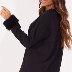 Robe Pull Oversize En Velours Côtelé Noir à Manchettes En Fausse Fourrure