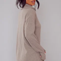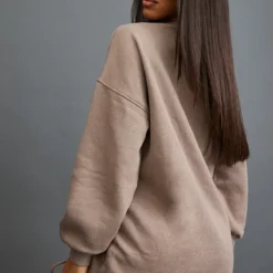 Robe Pull Oversize Côtelée Vert Sauge Kaki à Col Haut Et Demi-zip