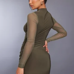 Robe Très Moulante Froncée Kaki Mousse Découpée à Manches En Mesh