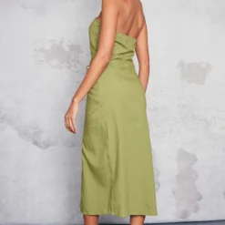 Robe Longue En Maille Côtelée Vert Olive à Découpes Et Noeud